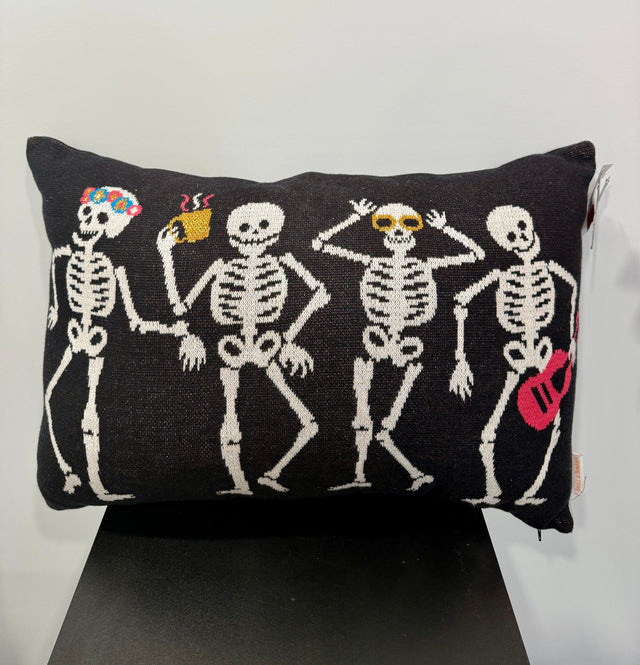 Turn up the spooky fun with our Dancing Skeletons Pillow. Featuring a parade of skeletons—one with a flower crown, one holding coffee, another rocking shades, and one jamming with a guitar—this playful design adds a lighthearted twist to Halloween décor.