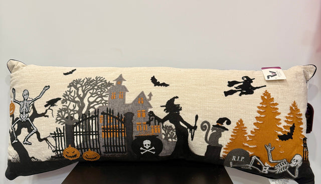 Set the scene for spooky season with our Haunted House Halloween Lumbar Pillow. This festive decorative pillow features a detailed haunted house scene complete with witches, skeletons, black cats, bats, and pumpkins—everything you love about Halloween in one cozy accent piece.
