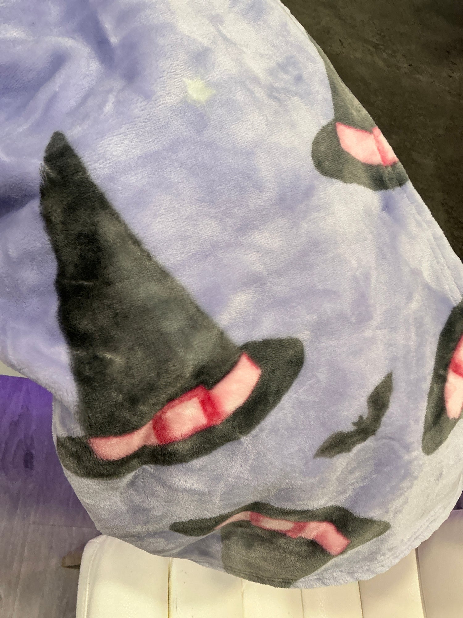 • 🎩 Plush throw with witch hat, bat, and star pattern