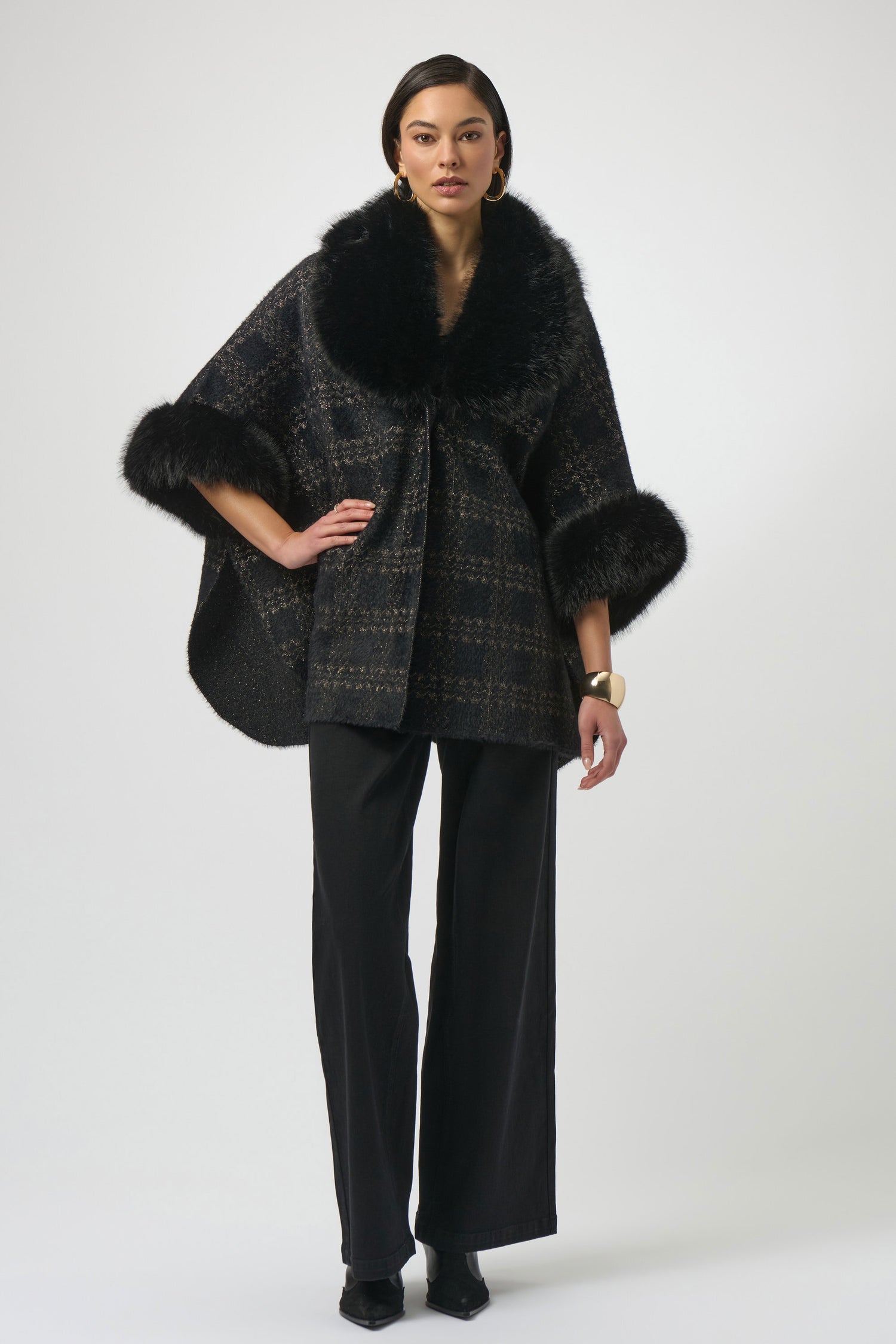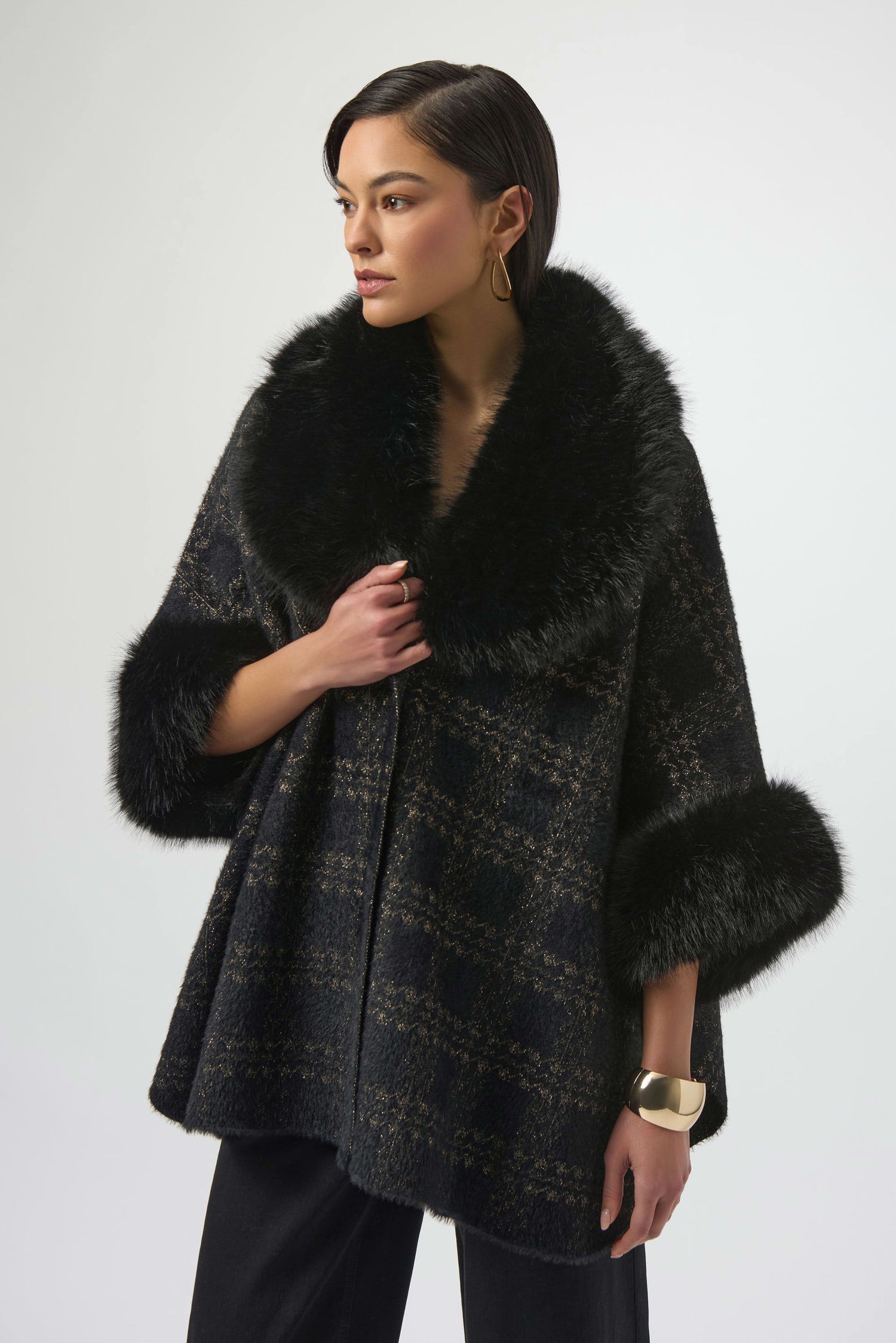This sophisticated cape elevates any ensemble with its exquisite plaid jacquard knit and timeless shawl collar. The faux fur trim adorning both collar and cuffs adds a touch of glamour, while a single statement button closure creates a beautifully draped silhouette.