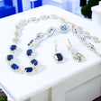 The matching lever-back earrings complete the ensemble with perfect harmony - radiant simulated sapphire drops that illuminate the face like the last golden rays of a Maldivian sunset.
