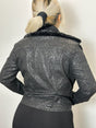 FAUX FUR COLLARED BLACK JACKET WITH SUBDUED SNAKESKIN PATTERN AND POCKET FRONT.